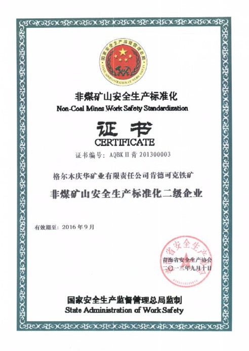 中國慶華青海消息(徐芳)近日,格爾木礦業公司肯德可克鐵礦獲得了青海省安全生產協會頒發的非煤礦山安全生產標準化證書和“非煤礦山安全生產標準化二級企業”稱號。 礦業公司自申請礦山二級標準化驗收工作以來,進一步加強了對礦山安全工作的監管,對安全管理薄弱環節、標準化工作進行了系統梳理,認真排查安全隱患,安全管理工作水平進一步挺高。 肯德可克鐵礦順利通過安全生產二級標準化驗收,標志著公司安全生產標準化工作正式步入規范化管理軌道,為打造本質安全型企業奠定了堅實的基礎。